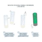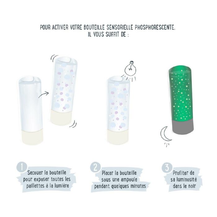 En approchant la bouteille sensorielle d’une source lumineuse, vous prolongerez la durée de brillance des paillettes phosphorescentes, garantissant une nuit encore plus magique !